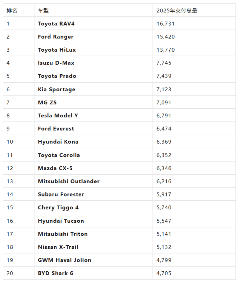 在维州的榜单里,特斯拉Model Y和奇瑞瑞虎4(Tiggo 4)的表现也非常抢眼,说明维州人既爱传统,也爱性价比。