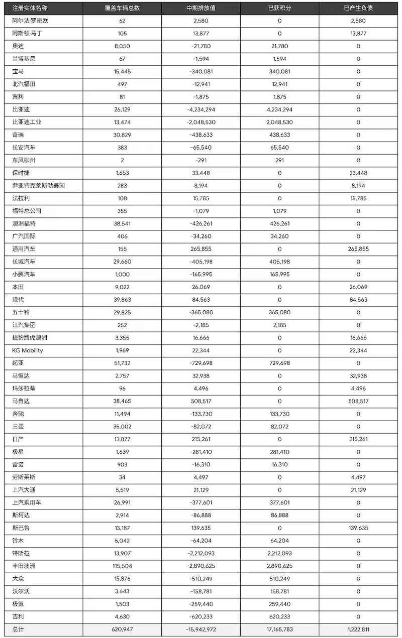 相比之下,丰田(Toyota)的表现就稳健得多。虽然丰田卖出了 115,504 辆车,体量巨大,但凭借其深耕多年的混合动力技术,它不仅没有负债,反而积攒了 289 万个积分额度。