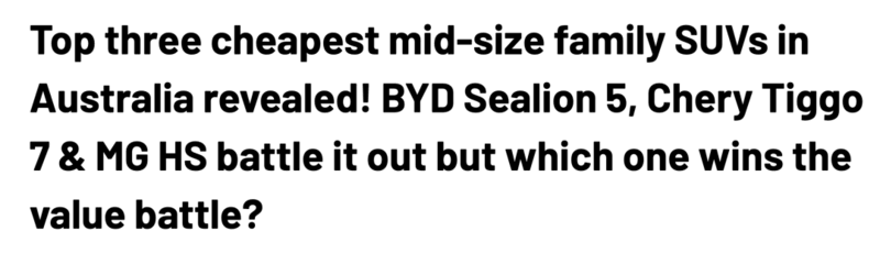 其中三款最便宜的中型家用SUV分别是——奇瑞Tiggo 7(瑞虎7)、比亚迪海狮05(Sealion 5)以及名爵HS(MG HS)。