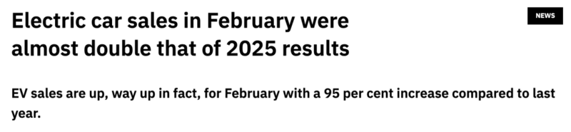 如今的澳洲消费者们正在经历一场群体意识觉醒,再配合上2026年初的新车潮,2月份电车的销量自然完成了成倍的增长。