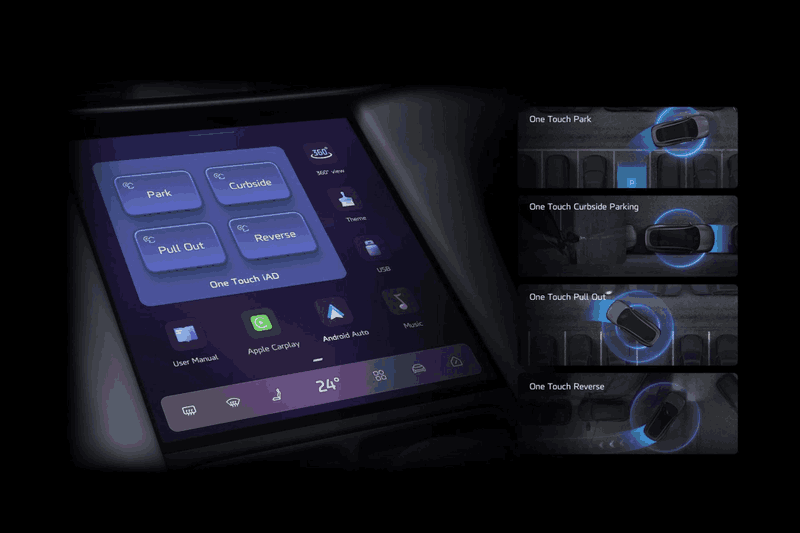- 一键全功能(One Touch IAD): 这套系统包含了一键循迹(Trace-back)功能,它能记忆最后100米的行驶轨迹。如果你在狭窄的小巷里开到了尽头,别担心倒车会磕碰,系统会顺着原路自己退出来。此外还有一键泊车、一键贴边和一键脱困,基本消灭了停车操作问题。
