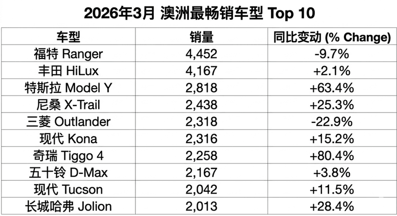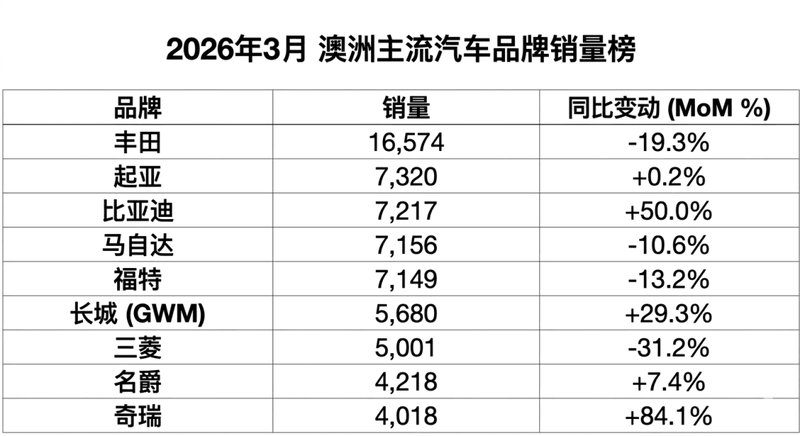 2026年3月的澳洲车市数据新鲜出炉了,白纸黑字的数字让老大哥丰田再度脊背发凉。澳洲似乎已经快要成了中国车的主场了。