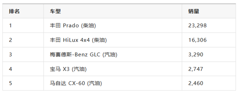 在柴油轻混领域,丰田 Prado(23,298辆)和丰田 HiLux 4×4(16,306辆)表现抢眼;