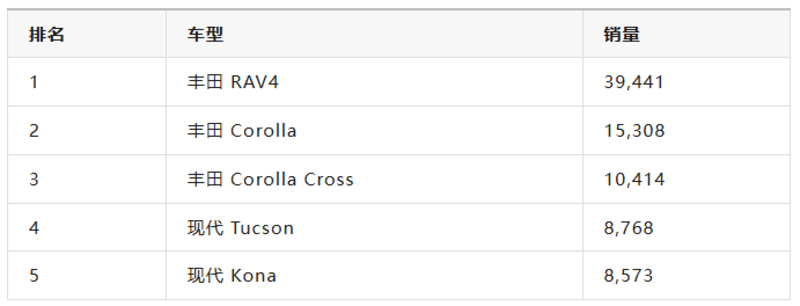 现代 Tucson(8,768辆)和Kona(8,573辆)虽然与丰田的销量差距明显,但也凭借出色的产品力在混动市场中占据了一席之地。