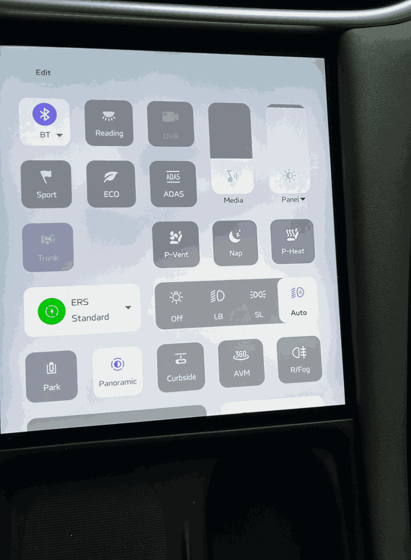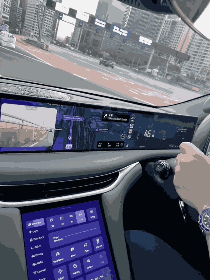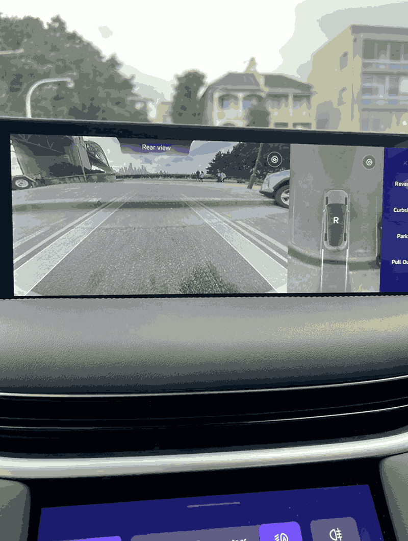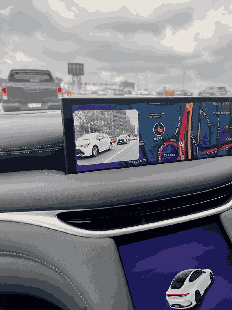 通过车身周围那一堆摄像头(包括翼子板、后视镜上的),它能在中控大屏上通过AI增强技术,实时显示车身两侧的盲区画面。