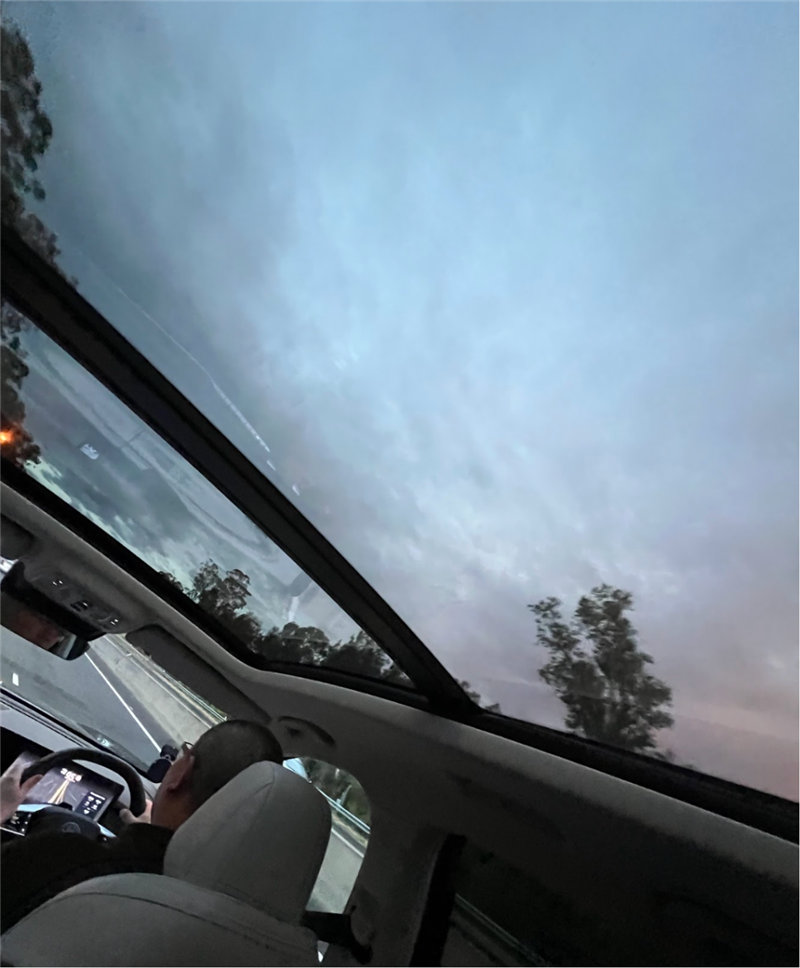 QS的全景天窗几乎从车头开到了车尾,像湖水般清澈,又想草原般宽阔。天空从全景天窗涌了进来,真有种沁人心脾的感觉。