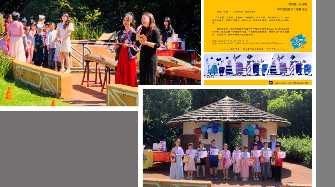 2022年9月25日,由瀚文书院、悉尼青少年诗歌沙龙主办的“赏春盈,品诗情”2022 春游诗会在法根公园(Fagan Park)成功举办。 活动特别邀请了著名艺术评论人晓帆先生、著名华裔诗人艾琳女士、瀚文书院院长Jessica女士、大同中文学校董方校长、双艺堂校长范雪强先生为2022写给妈妈的诗特别活动、2021第四届全球华语朗诵大赛、 2020 国际青少年公益书画作品征集活动和2020 上海国际青少年诗书画大赛(澳洲赛区)颁奖。